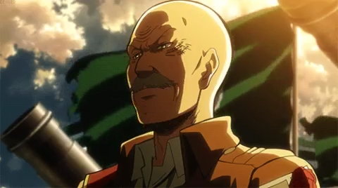 4 - Dot Pixis, de Shingeki no Kyojin, ou "l'attaque des titans" en français : Ce haut-gradé excentrique, tout chauve, sa grosse moustache ressortant bien sur son visage, est membre de la Patrouille du Mur, et pour moi, c'est quand-même un personnage mémorable ; il agit comme bon lui semble et se moque bien de ce qu'on peut penser de lui. Je l'ai tout de suite bien aimé ce perso. De plus, c'est un père de famille qui a trois enfants et qui est marié ; mais il aime bien boire avant d'aller à l a bataille, ce qui ne le rend pas vraiment sexy. Je pense que son côté un peu rebele m'a bien plu.